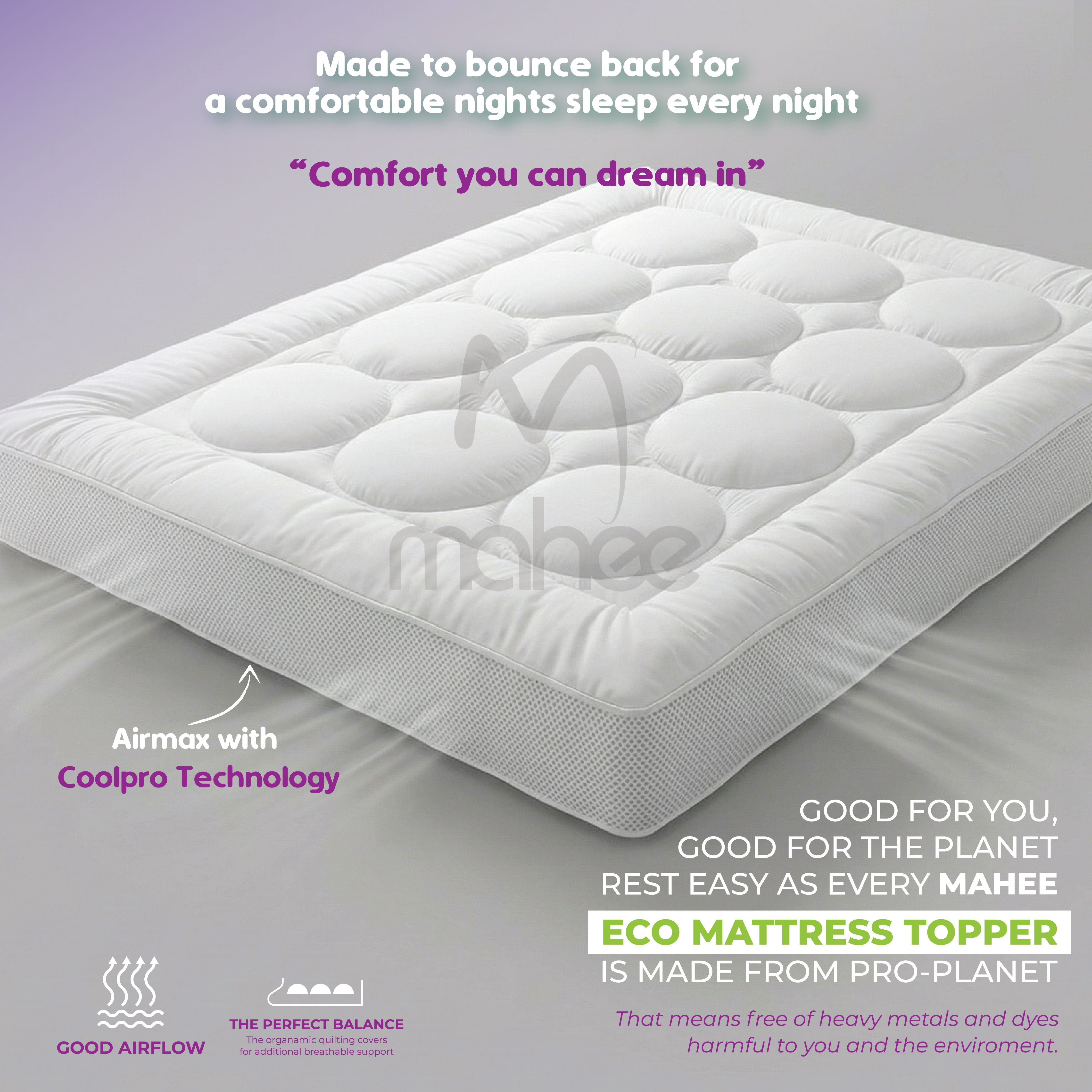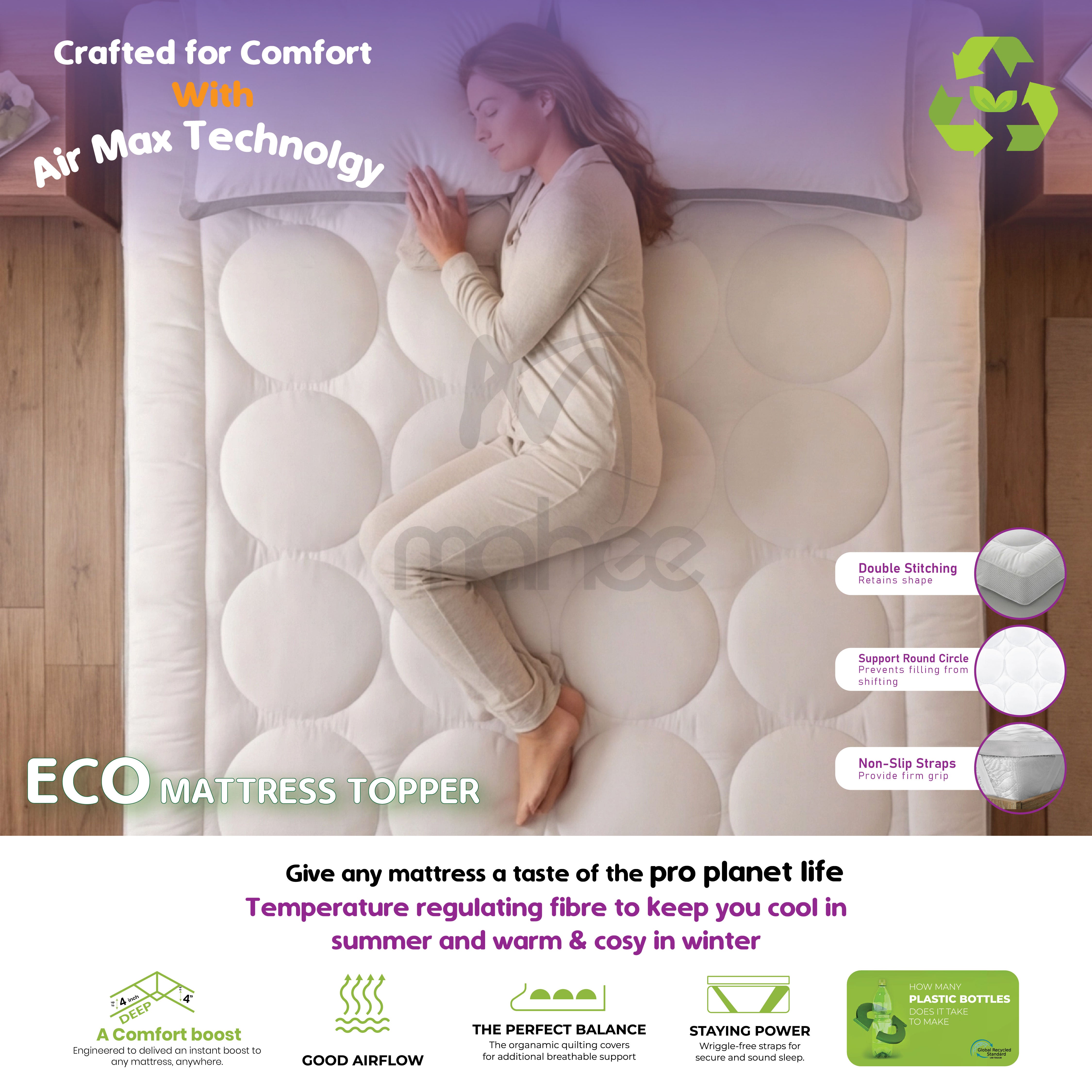 The Extra Thick Mattress Topper with Air-Max Technology specially designed to increase airflow, the airmax topper features dual construction which allows air to move freely in-between layers. The air mesh sides help this air to move freely around your body to keep you comfortable in every season. Deeply filled with 3D ReGen Recycled Fiber.