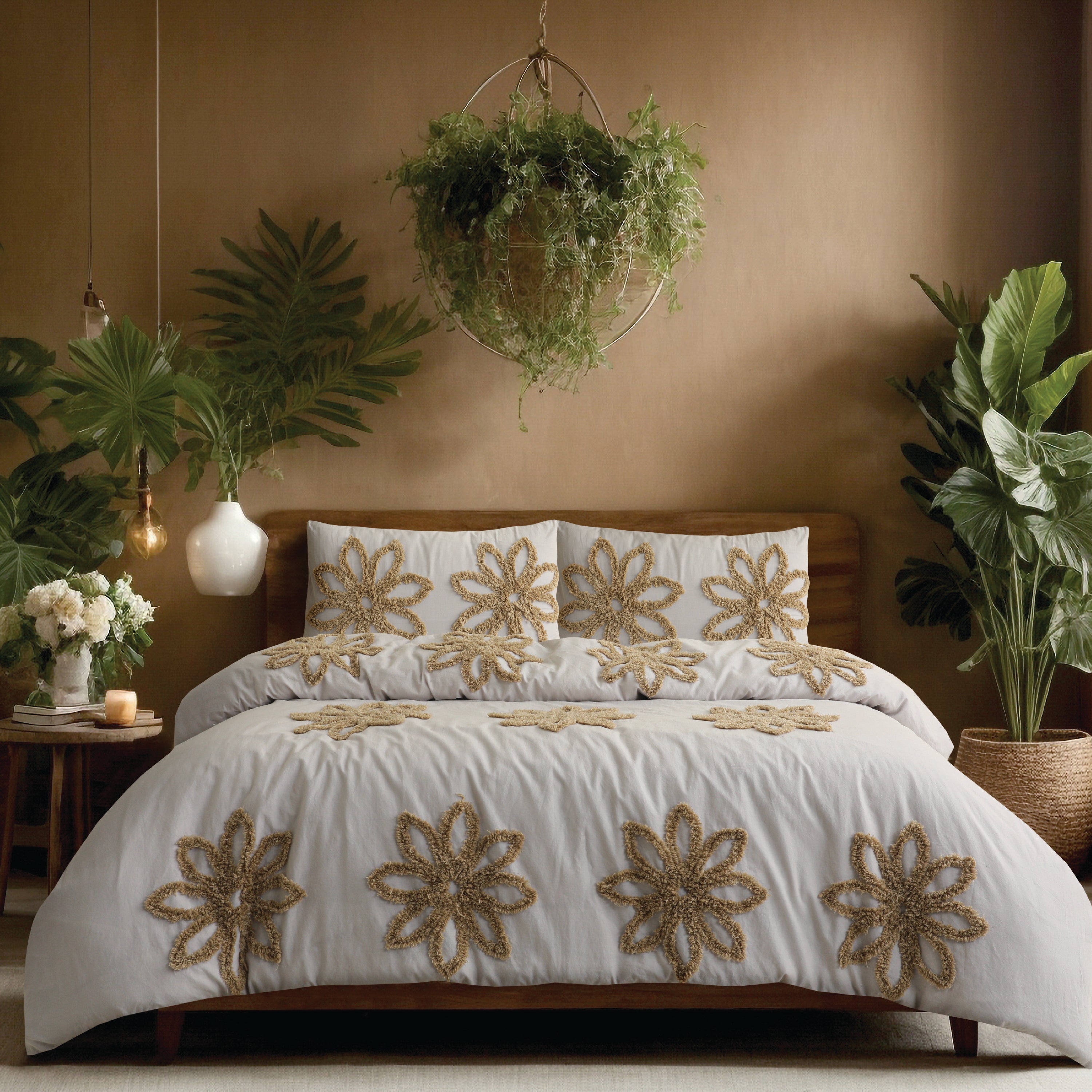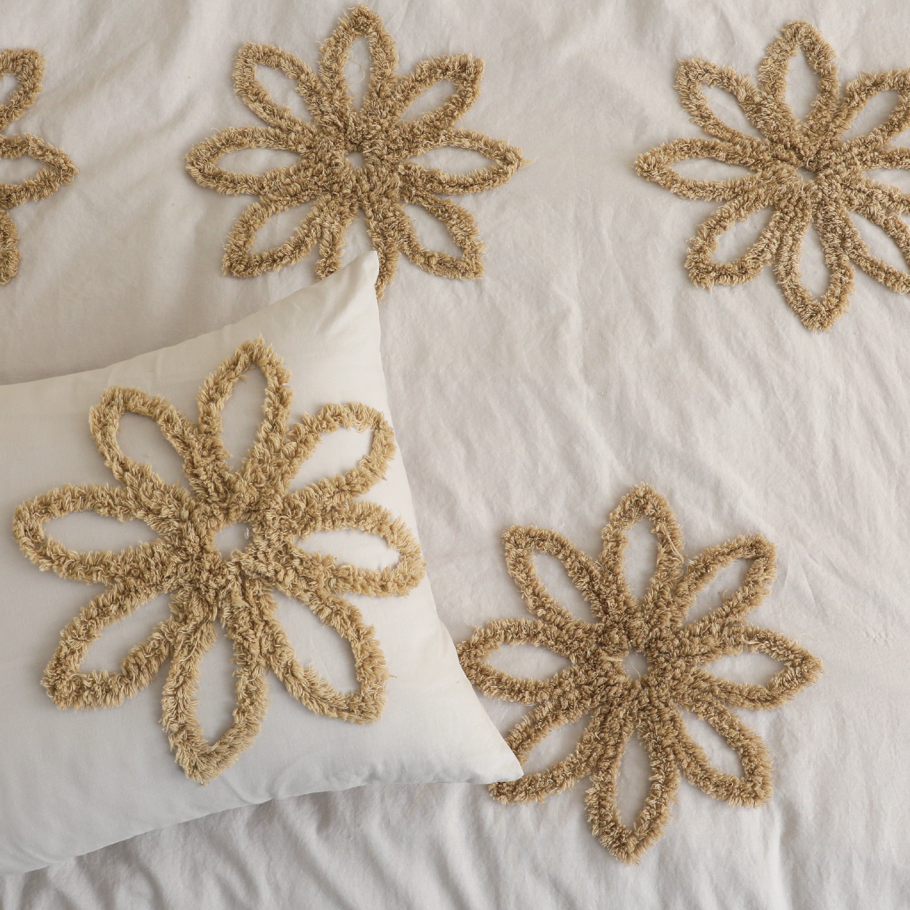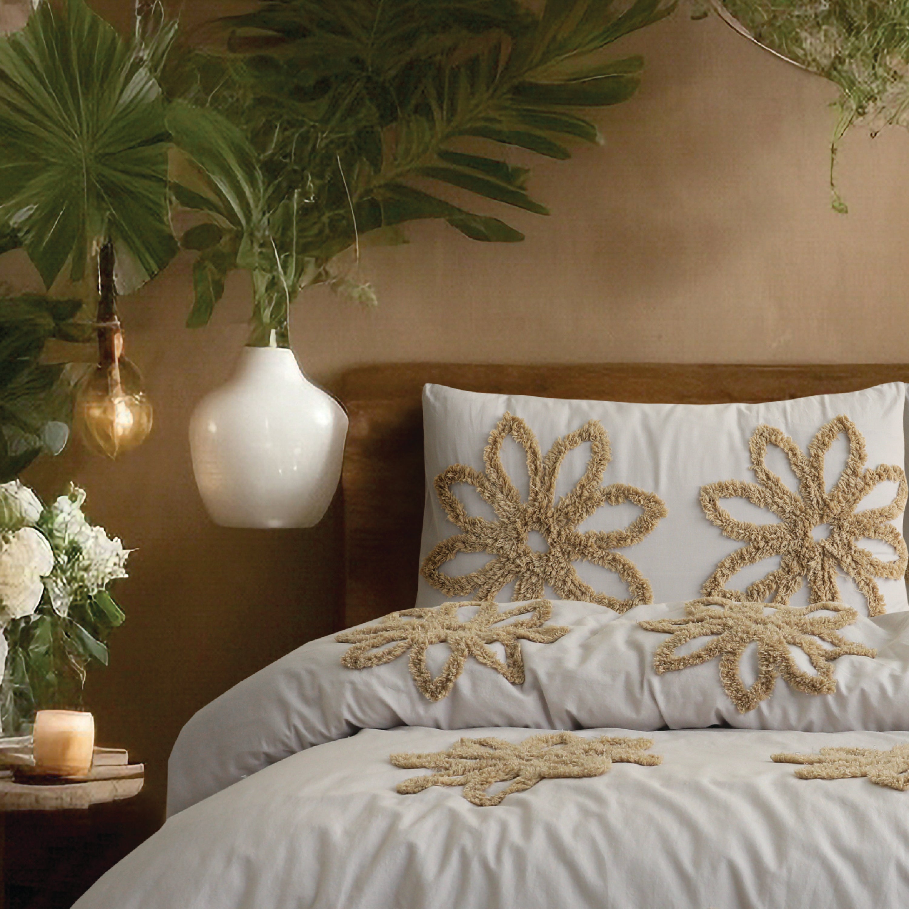 A perfect fusion of artisanal detailing and modern minimalism. Inspired by the beauty of nature, this set showcases floral tufted embroidery. The intricate raised motifs are designed to bring texture, warmth, and elegance into your space, evoking the feeling of fresh blooms gently unfolding at dawn. The calming neutral palette—soft ivory with subtle beige embroidery—adds a sense of tranquility and blends effortlessly with both classic and contemporary decor styles. Crafted for comfort and longevity, the 100% cotton fabric offers a crisp yet cozy hand feel that softens beautifully with each wash.