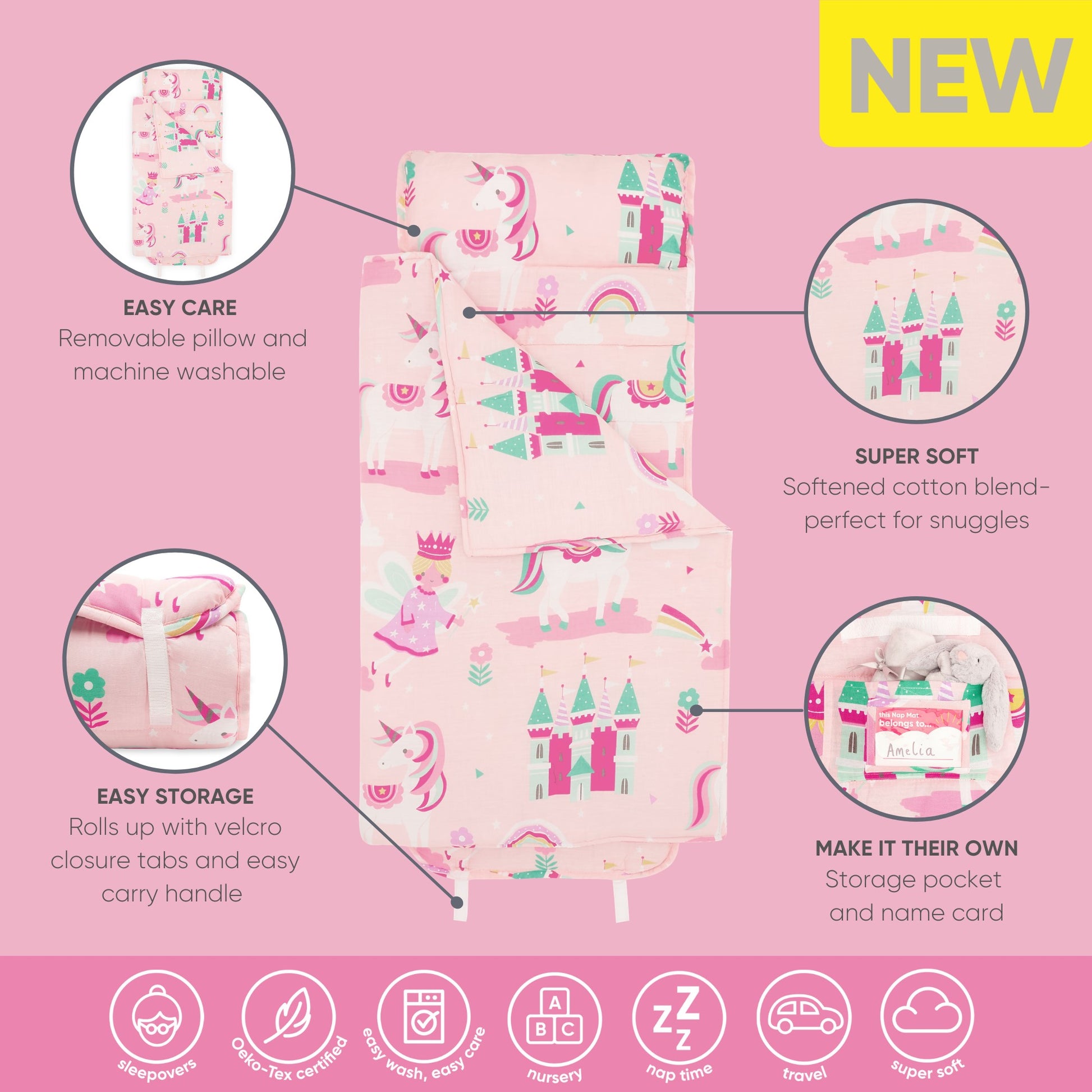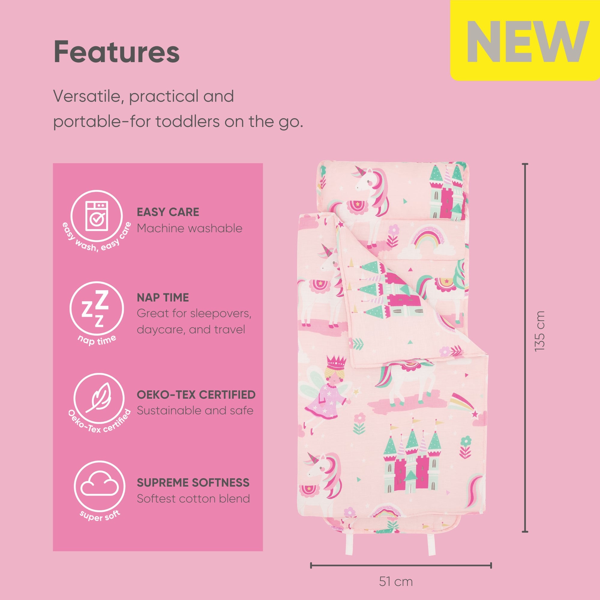 Little ones will dream easy with this pretty and vibrant Baby Sleeping Bed - Magic Unicorn illustrated with fairies, unicorns, rainbows and princess castles, it also makes the perfect gift. product is inclusive of a convenient colour coordinated carry loop.