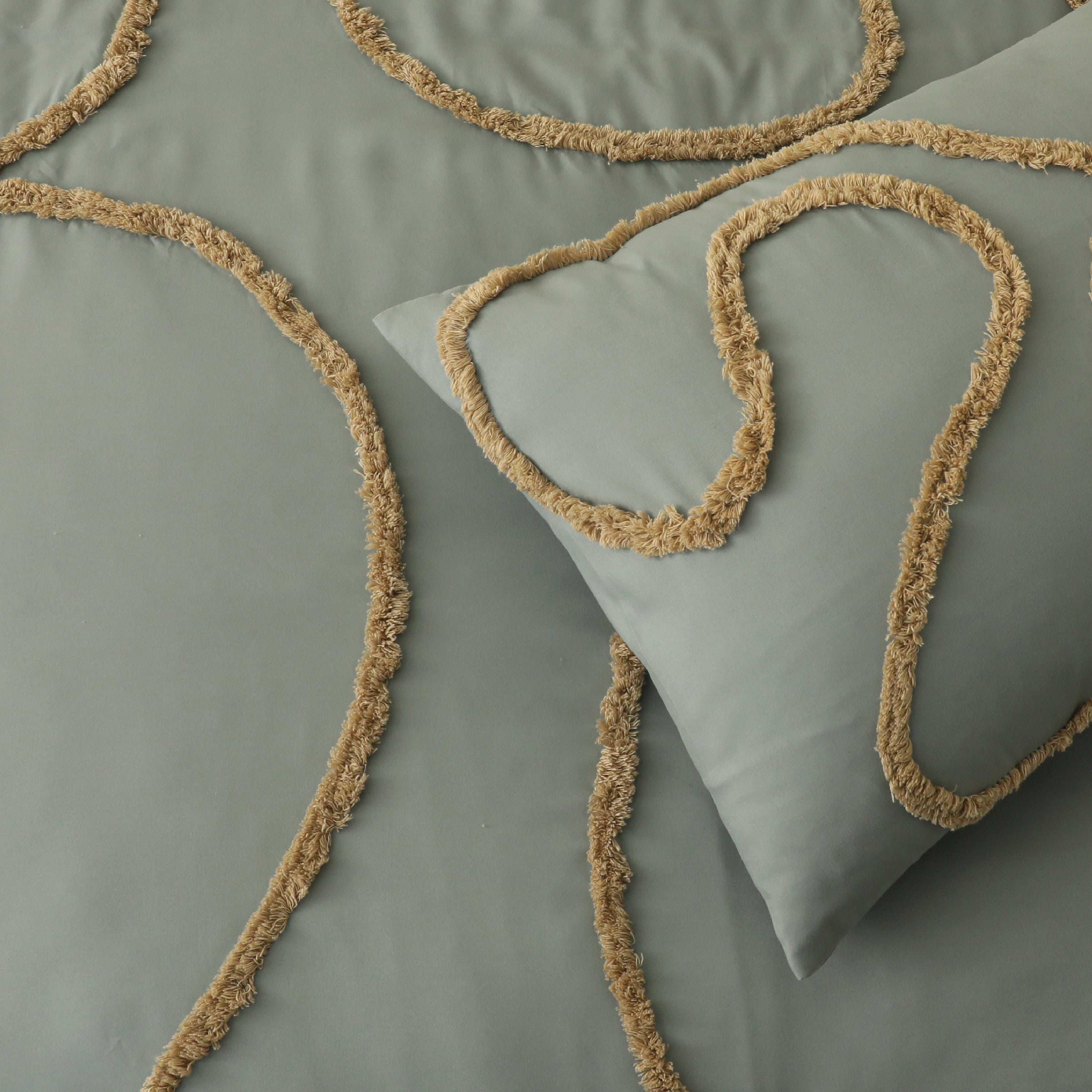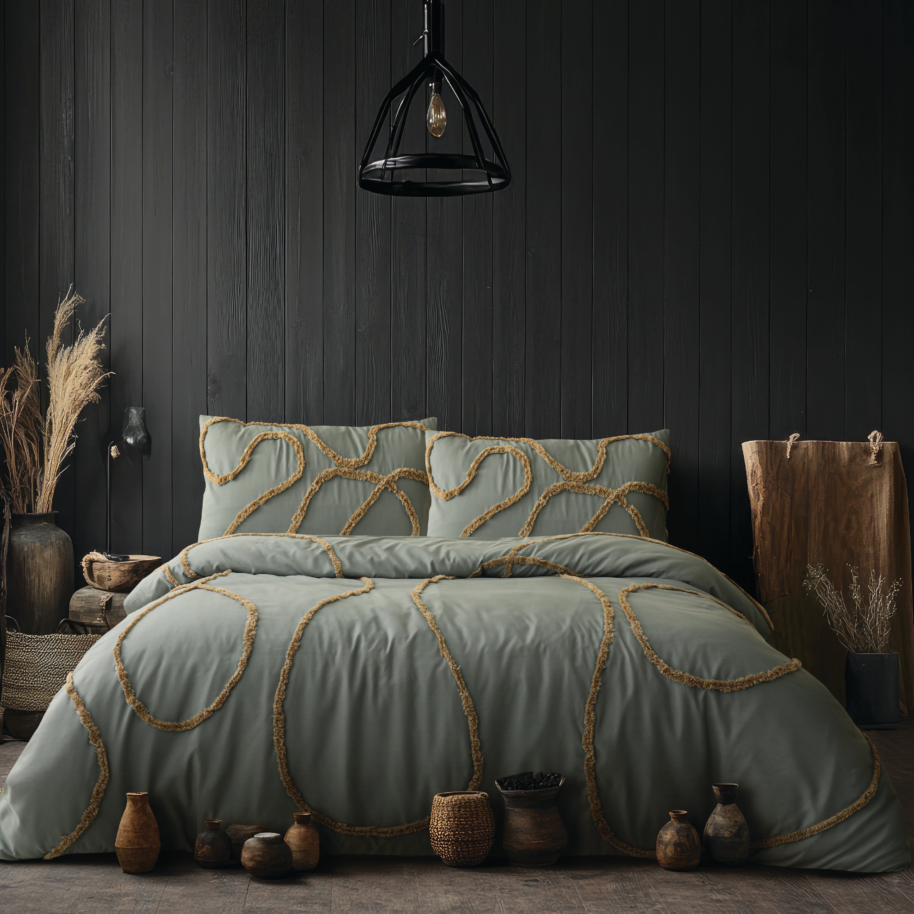 Bring an earthy sophistication to your bedroom with this Infinity tufted duvet set, where organic artistry meets modern minimalism. The muted green base serves as a serene backdrop for free-flowing, tufted lines in a warm ochre tone, reminiscent of nature’s winding paths. Crafted from soft, breathable fabric, the duvet offers year-round comfort while the raised chenille texture adds depth and tactile charm. Perfect for interiors that embrace natural textures, muted palettes, and artisanal craftsmanship, this set transforms your space into a cozy retreat with a touch of refined elegance.